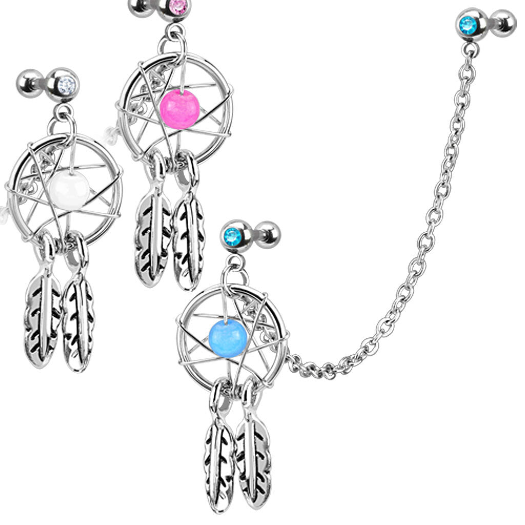 Surgical Stainless Steel Dream Catcher with Jewelled Double Cartilage/Tragus Barbell Chain Linked Dangle.