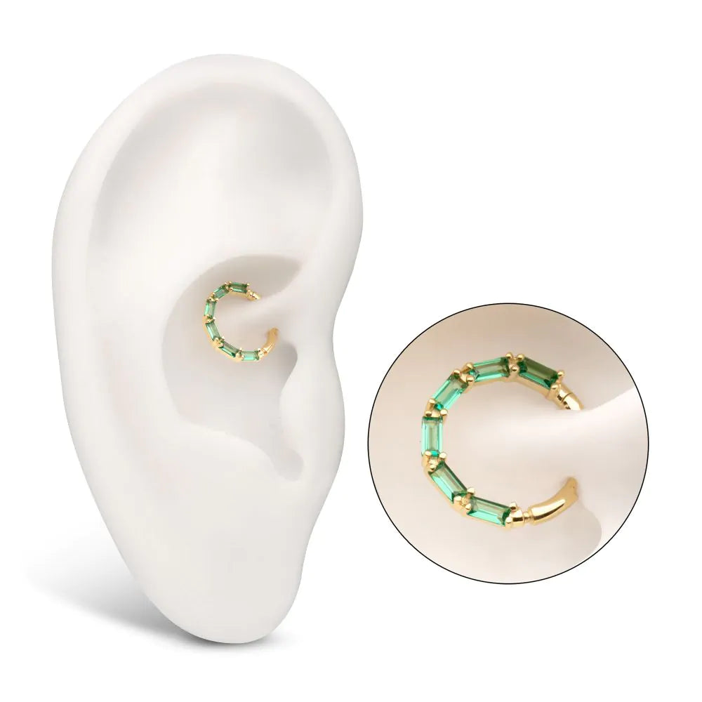 14Kt Yellow Gold 6-Cluster Baguette Prong Gem Front Facing Hinged Segment Clicker 1.2mm (16g). The Hinged Segment Clicker offers an easy-to-use design with a minimal seam for an aesthetic that's similar to a segment ring without the stress of dealing with a segment that can get lost. The Hinged Segment Clicker is characterized by the hinged prong that snaps into place with a satisfying click. Perfect for Helix, Septum and Cartilage. Made of solid 14kt nickel-free Gold.