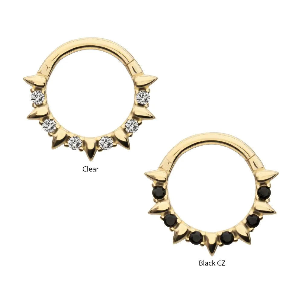 14Kt Yellow Gold Alternating Spike & Prong Set Round Gem Front Facing Hinged Segment Clicker. With a 1.2mm (16g) gauge and an internal diameter of 8mm. The Hinged Segment Clicker offers an easy-to-use design with a minimal seam for an aesthetic that's similar to a segment ring without the stress of dealing with a segment that can get lost. The Hinged Segment Clicker is characterized by the hinged prong that snaps into place with a satisfying click. Perfect for Helix, Septum, and Cartilage. Made of solid 14kt nickel-free Gold.