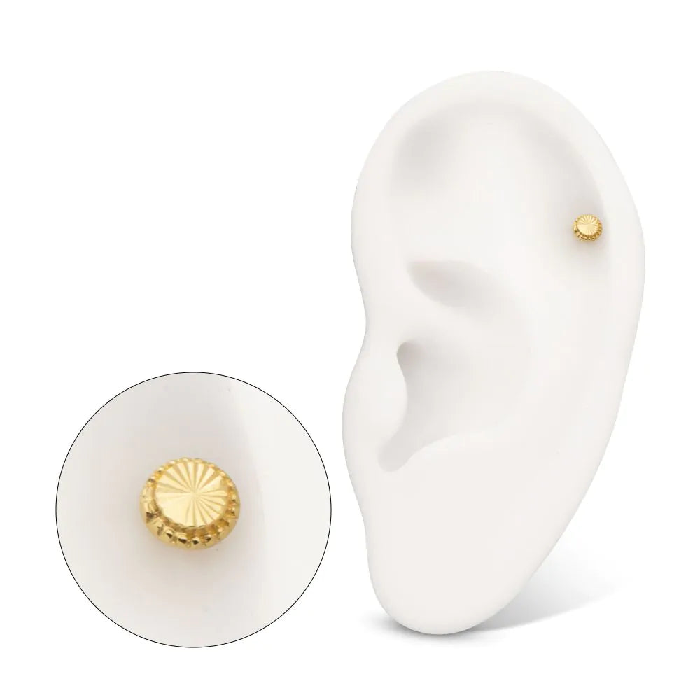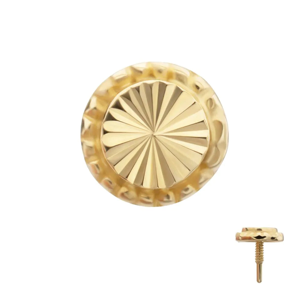 The corrugated round top combines classic symmetry with subtle radiance, featuring a textured finish and elegant milgrain border in solid 14KT yellow gold. Its longer M0.8 threading offers an exceptionally stable fit and smooth engagement for easy installation and secure wear. Pin Size: 0.45mm x 4.7mm. Piece size