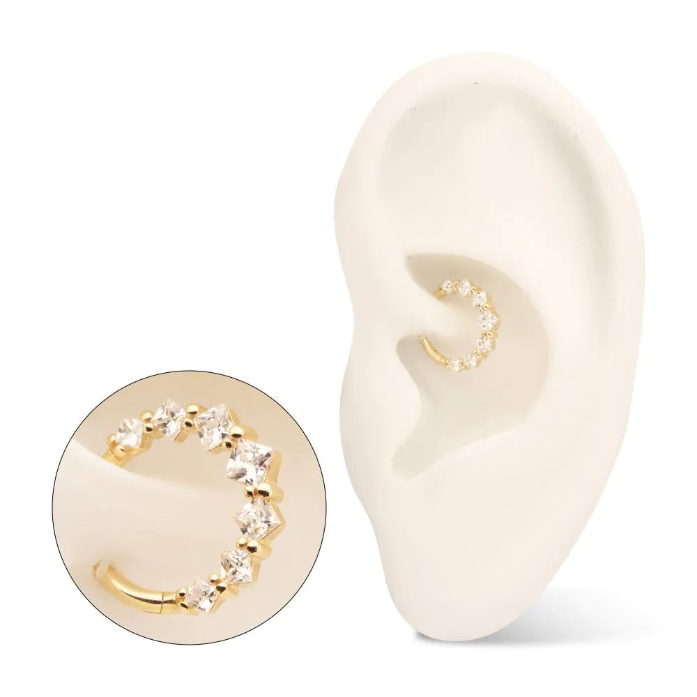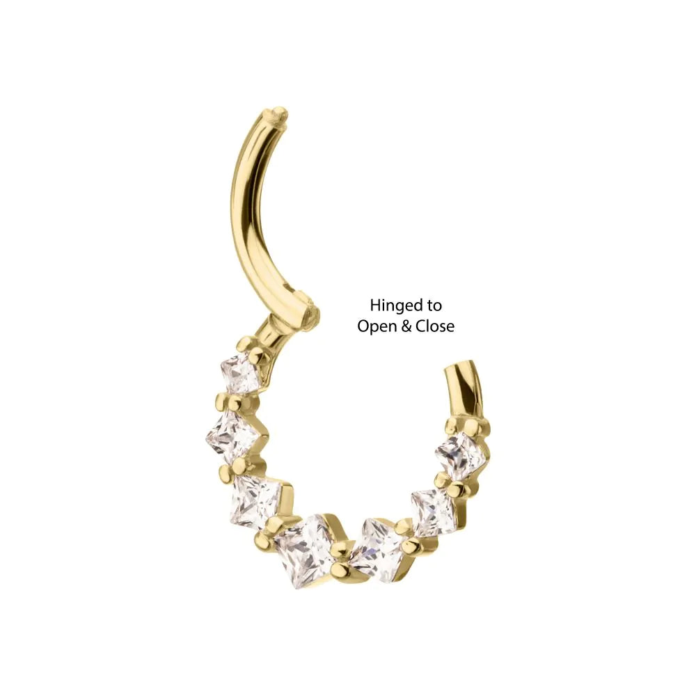 14Kt Yellow Gold Prong Set Princess Gem Cluster Front Facing Hinged Segment Clicker. The Hinged Segment Clicker offers an easy-to-use design with a minimal seam for an aesthetic that's similar to a segment ring without the stress of dealing with a segment that can get lost. The Hinged Segment Clicker is characterized by the hinged prong that snaps into place with a satisfying click. Perfect for Helix, Septum and Cartilage. Made of solid 14kt nickel-free Gold.