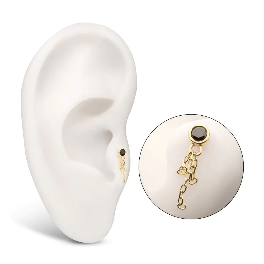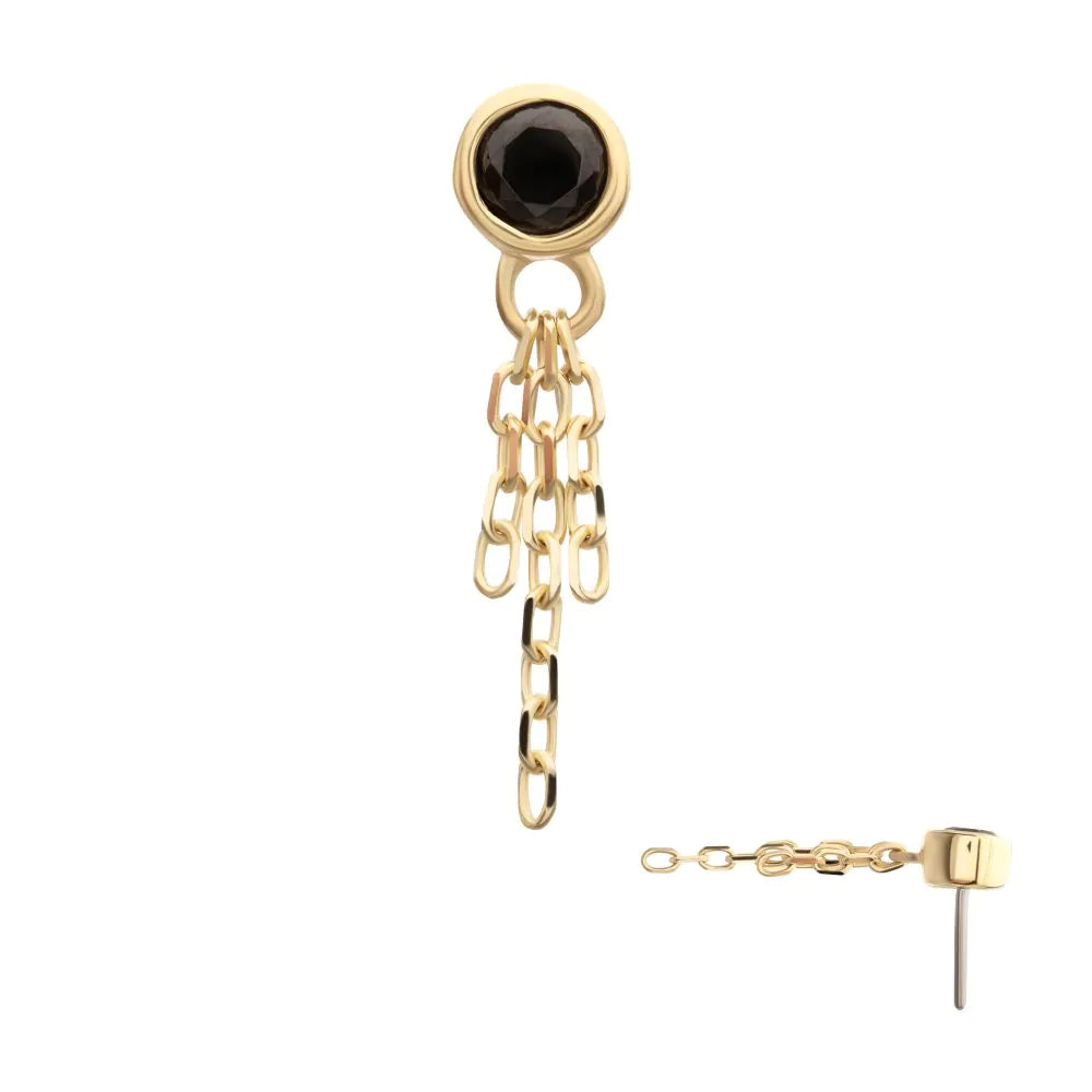 14Kt Yellow Gold Threadless Bezel Set Gem Top with Triple Chain Dangle. Made from Solid 14Kt Nickel-Free Gold with durable 316LVM ASTM F-138 Implant Grade Steel. Pin Size: 0.45mm x 4.7mm. Piece size 3.3mm (L) x 3.3mm (W) x 2.1mm (THK)