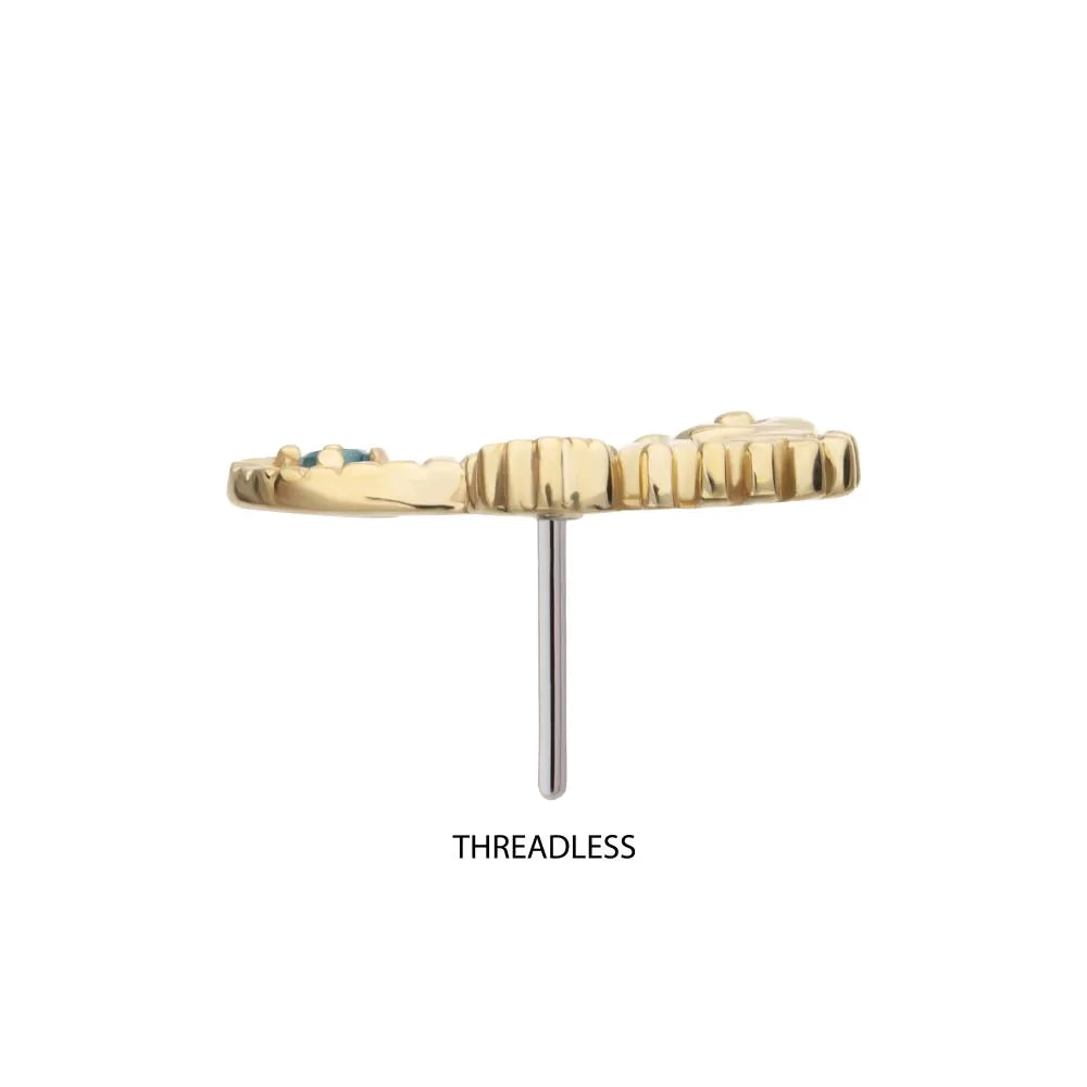 14Kt Yellow Gold Threadless Etched Seahorse Top with Prong Set Aqua Gem. Etched seahorse holding an aqua CZ gem adds a pop of colour. Made of solid 14kt nickel-free Gold with durable 316LVM ASTM F-138 Implant Grade Steel Pin designed to be practical and easy to use. Fits all sizes of pins and bases in our threadless body jewellery line. Pin Size: 0.45mm x 4.7mm. Piece size 9.7mm (L) x 5.5mm (W) x 1.6mm (THK)
