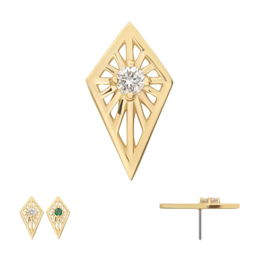 14Kt Yellow Gold Threadless Prong Set Round CZ Gem on a Radiant Kite Shape Top. Made from Solid 14Kt Nickel-Free Gold with durable 316LVM ASTM F-138 Implant Grade Steel Pin (0.45mm x 4.7mm), designed to be practical and easy to use. Piece size 11mm (L) x 6mm (W) x 1.5mm (THK).