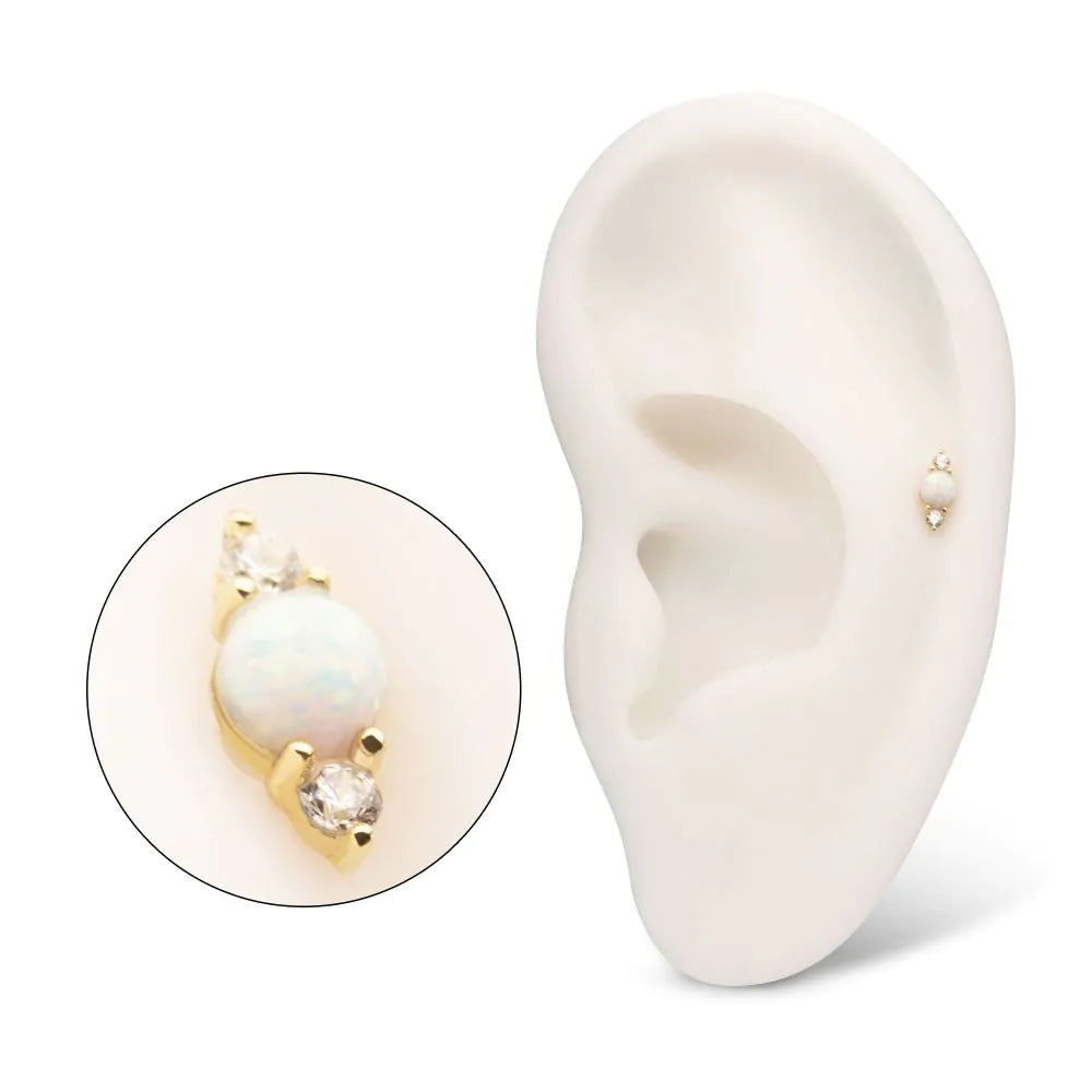 14Kt Yellow Gold Threadless Prong Set White Opal & Clear CZ CZ Gem Cluster Top. Made from Solid 14Kt Nickel-Free Gold with durable 316LVM ASTM F-138 Implant Grade Steel Pin (0.45mm x 4.7mm), designed to be practical and easy to use. Piece Size 7mm (L) x 3mm (W) x 2.4mm (THK).