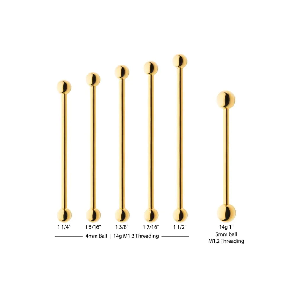 24KT Gold PVD Titanium Internally Threaded Industrial Barbell. Both ends are removable and thread off. Material sourced in the USA.Threading 16g M0.9, 14g M1.2.