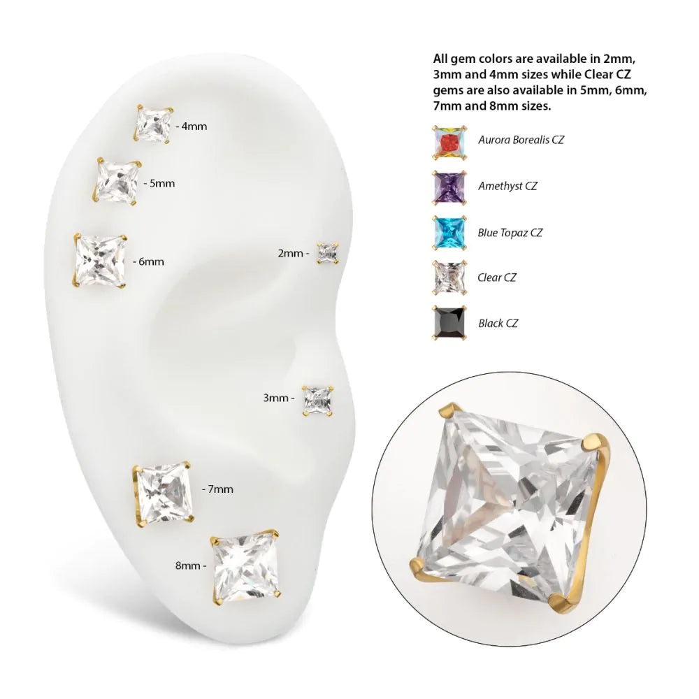 These tops feature a smooth, small, & flat base on the backside which transforms into a rounded smooth cup setting. The 4 prongs securely hold the square shaped gemstone in place while keeping it close to the skin. The mounting allows light to pass through the gem, enhancing its sparkle without protruding significantly from the piercing.