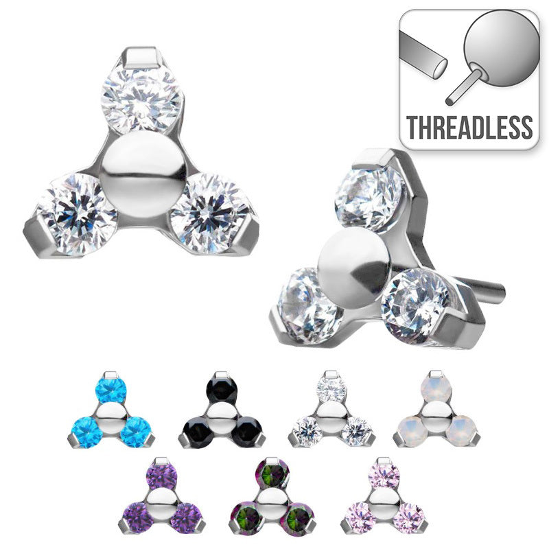 This threadless titanium prong set gem trinity attachment measures 5mm in diameter, comes in various colours and fits into any Invictus Titanium Threadless Stem. Choose from a variety of colors for this unique three-stone colored cubic zirconia threadless top. Made from titanium, it is an ideal piece for fresh piercings as well as jewelry upgrades.