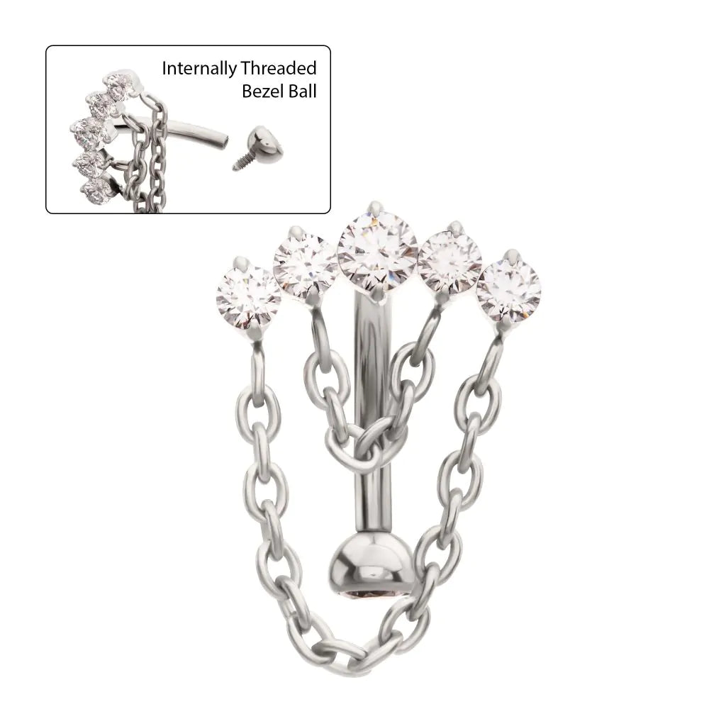 Invictus Titanium Internally Threaded 5-Cluster Prong Gem Fixed Top Curved Barbell with 2 Tier Chain Dangle