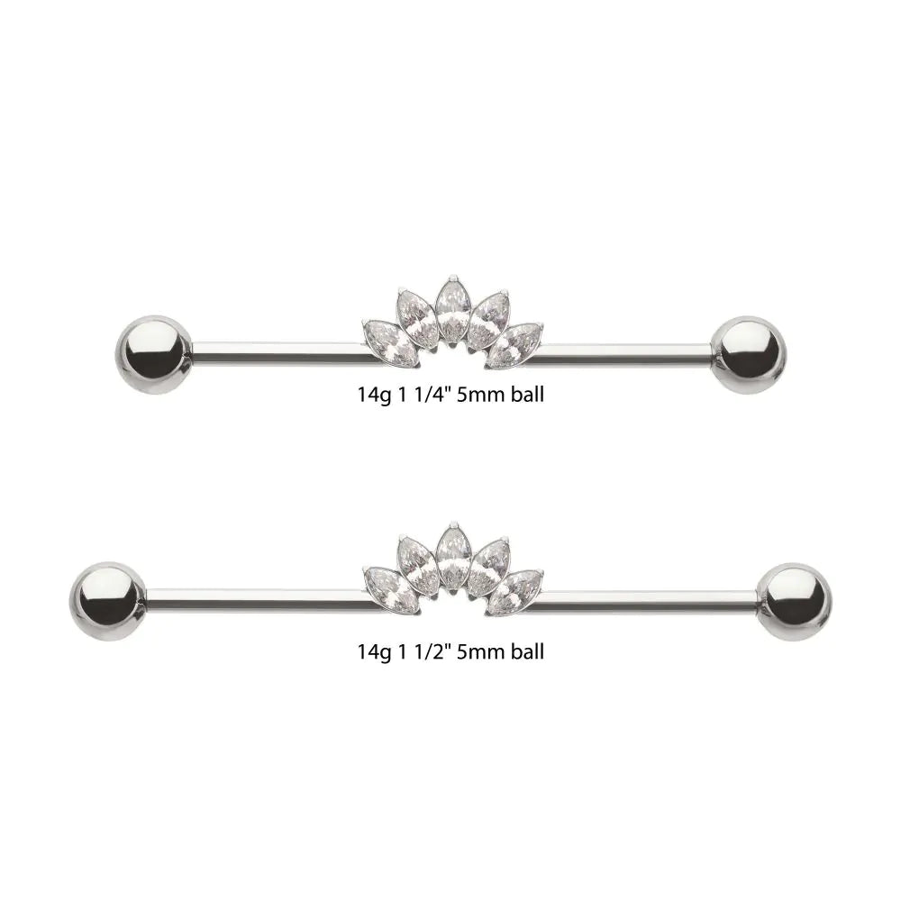 Titanium Internally Threaded 5 Marquise Gem Cluster with Ball End Industrial Barbell fits M1.2/14g Internally Threaded Jewelry. Manufactured from High Polish Implant Grade Titanium (Ti-6AL-4V-ELI ASTM F136). 1.6mm (14g) with 5mm balls.
