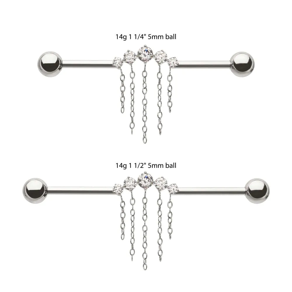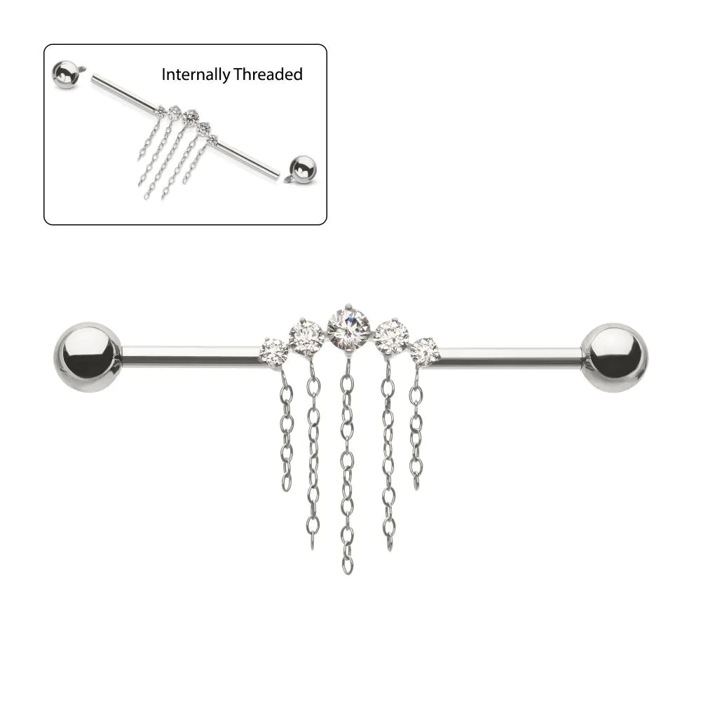 Titanium Internally Threaded 5 Round Prong Set Gem Cluster with 5 Chain Dangle & Ball End Industrial Barbell fits M1.2/14g Internally Threaded Jewelry. Manufactured from High Polish Implant Grade Titanium (Ti-6AL-4V-ELI ASTM F136).