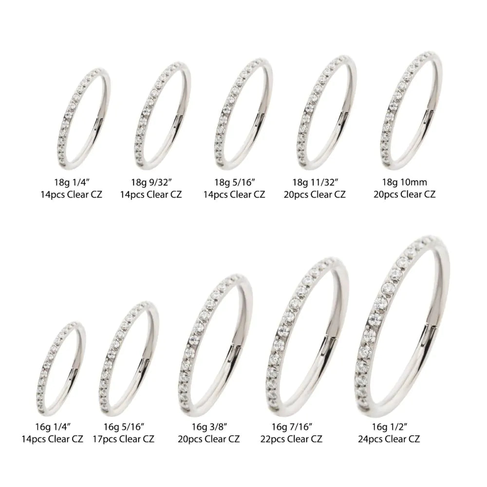 Titanium with 1mm CNC Set Clear CZ Eternity Gem Side Facing Hinged Segment Clicker is manufactured from High Polish Implant Grade Titanium (Ti-6AL-4V-ELI ASTM F136). Gem Size: 1mm.